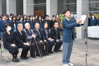 また東邦高校の生徒を代表して生徒会長の松﨑正太郎さん(2年)が「今年は平和の碑が建立されて30年目に当たります。毎日前を通るこの碑には、国籍や軍人、民間人の区別なく、すべての犠牲者を慰霊すると刻まれています。これは恒久平和への願いが込められた非常に意義深いものです。さまざまな活動を通じて『なごや平和の日』の設立に努めた先輩たちを引き継ぎ、悲惨な戦争の歴史を次世代に語り継ぐ担い手になります」と誓いの言葉としました。東邦高校では、平和を語り継ぐさまざまな活動を今も続けています。